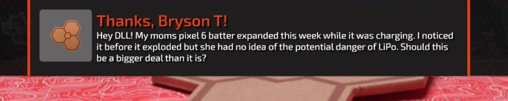 Thanks, Bryson T! Hey DLL! My moms pixel 6 batter expanded this week while it was charging. I noticed it before it exploded but she had no idea of the potential danger of LiPo. Should this be a bigger deal than it is?