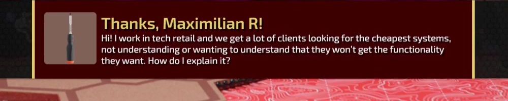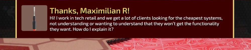 Thanks, Maximilian R! Hi! I work in tech retail and we get a lot of clients looking for the cheapest systems, not understanding or wanting to understand that they won't get the functionality they want. How do I explain it?