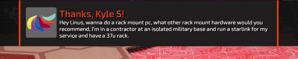 Thanks, Kyle S! Hey Linus, wanna do a rack mount pc, what other rack mount hardware would you recommend, I'm in a contractor at an isolated military base and run a starlink for my service and have a 37u rack.