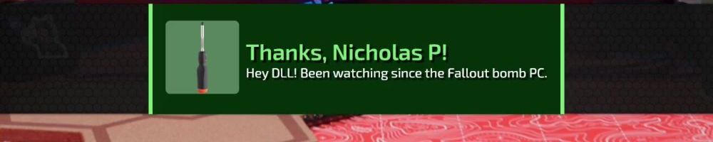 Thanks, Nicholas P! Hey DLL! Been watching since the Fallout bomb PC.