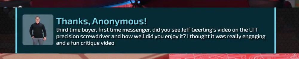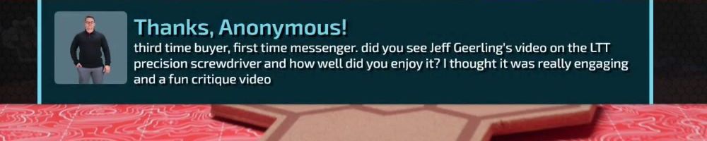 Thanks, Anonymous! third time buyer, first time messenger. did you see Jeff Geerling's video on the LTT precision screwdriver and how well did you enjoy it? I thought it was really engaging and a fun critique video