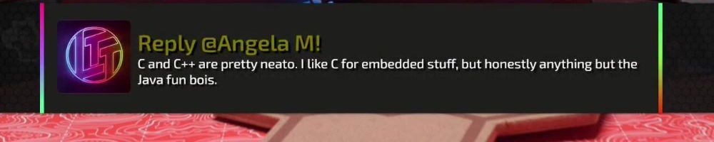 Reply @Angela M! C and C++ are pretty neato. I like C for embedded stuff, but honestly anything but the Java fun bois.