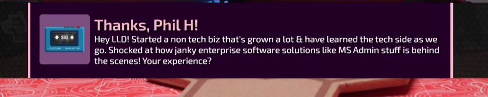 Thanks, Phil H! Hey LLD! Started a non tech biz that's grown a lot & have learned the tech side as we go. Shocked at how janky enterprise software solutions like MS Admin stuff is behind the scenes! Your experience?