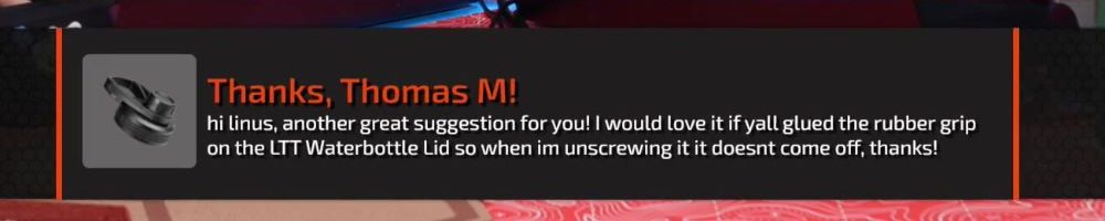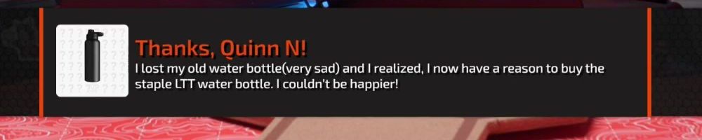 Thanks, Quinn N! I lost my old water bottle(very sad) and I realized, I now have a reason to buy the staple LTT water bottle. I couldn't be happier!