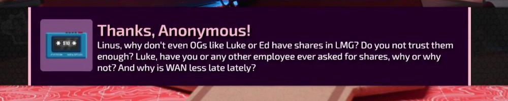 Thanks, Anonymous! Linus, why don't even OGs like Luke or Ed have shares in LMG? Do you not trust them enough? Luke, have you or any other employee ever asked for shares, why or why not? And why is WAN less late lately?