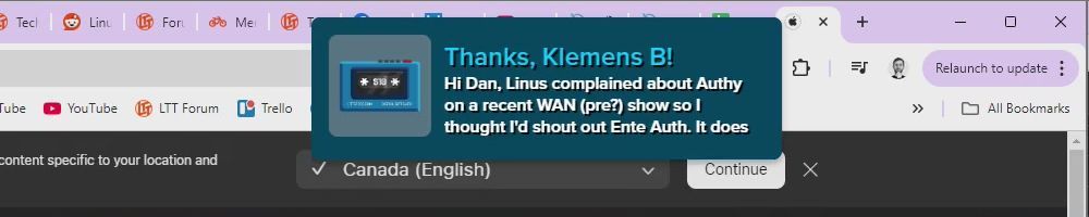 Thanks, Klemens B! Hi Dan, Linus complained about Authy on a recent WAN (pre?) show so I thought I'd shout out Ente Auth. It does