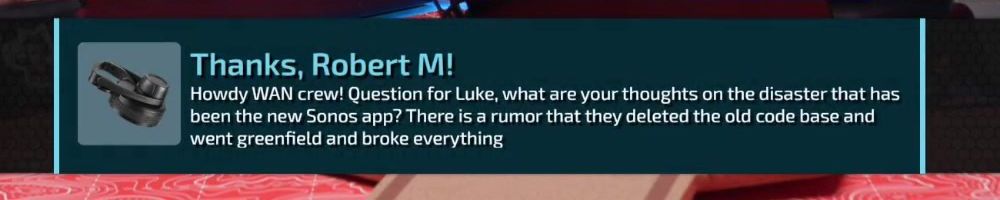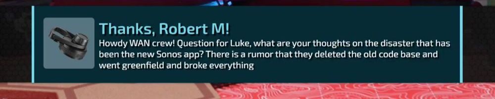 Thanks, Robert M! Howdy WAN crew! Question for Luke, what are your thoughts on the disaster that has been the new Sonos app? There