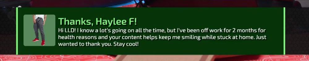 Thanks, Haylee F! Hi LLD! I know a lot's going on all the time, but I've been off work for 2 months for health reasons and your content helps keep me smiling while stuck at home. Just wanted to thank you. Stay cool!