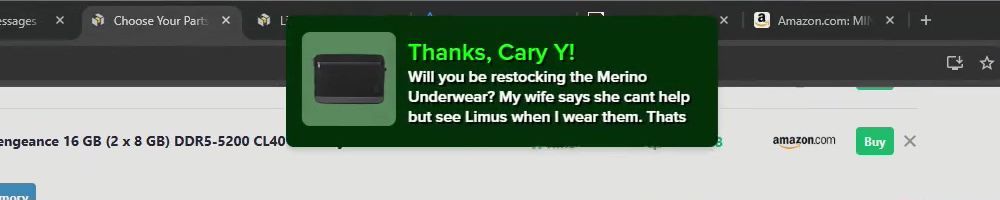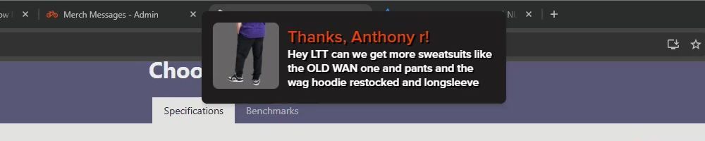 Hint: Use CTRL + F to search messages in this show, or use Whenplane's WAN Show Search tool to search for messages in all shows. Make sure that the "Merch Messages" box is checked when you search for something.