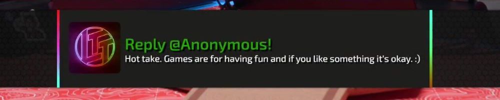 Reply @Anonymous! Hot take. Games are for having fun and if you like something it's okay. :)