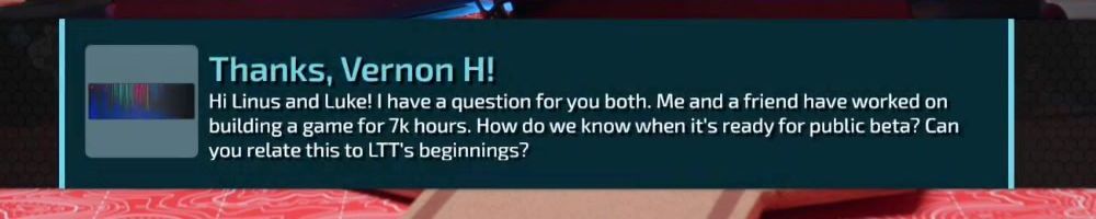 Thanks, Vernon H! Hi Linus and Luke! I have a question for you both. Me and a friend have worked on building a game for 7k hours. How do we know when it's ready for public beta? Can you relate this to LTT's beginnings?