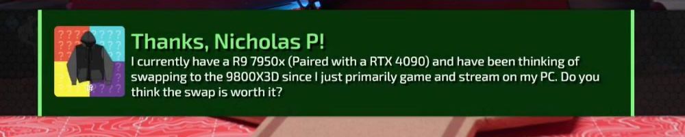 Thanks, Nicholas P! I currently have a R9 7950x (Paired with a RTX 4090) and have been thinking of swapping to the 9800X3D since I just primarily game and stream on my PC. Do you think the swap is worth it?