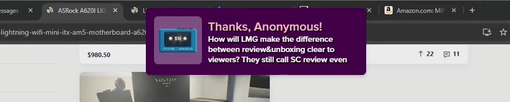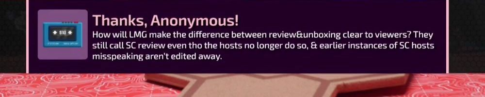 Thanks, Anonymous! How will LMG make the difference between review&unboxing clear to viewers? They still call SC review even tho the hosts no longer do so, & earlier instances of SC hosts misspeaking aren't edited away.