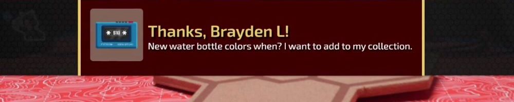 Thanks, Brayden L! New water bottle colors when? I want to add to my collection.