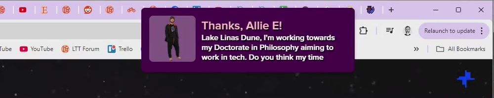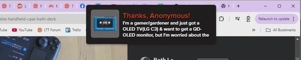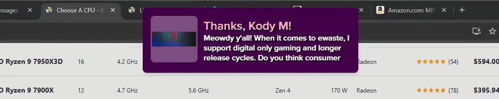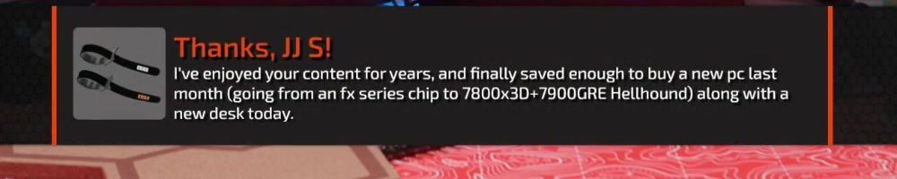 Thanks, JJ S! I've enjoyed your content for years, and finally saved enough to buy a new pc last month (going from an fx series chip to 7800x3D+7900GRE Hellhound) along with a new desk today.