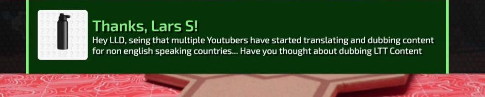 Thanks, Lars S! Hey LLD, seing that multiple Youtubers have started translating and dubbing content for non english speaking countries... Have you thought about dubbing LTT Content
