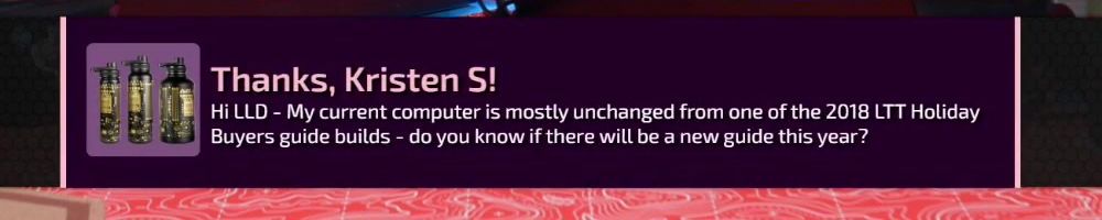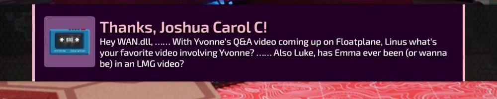 Thanks, Joshua Carol C! Hey WAN.dLL, With Yvonne's Q&A video coming up on Floatplane, Linus what's your favorite video involving Yvonne? Also Luke, has Emma ever been (or wanna be) in an LMG video?