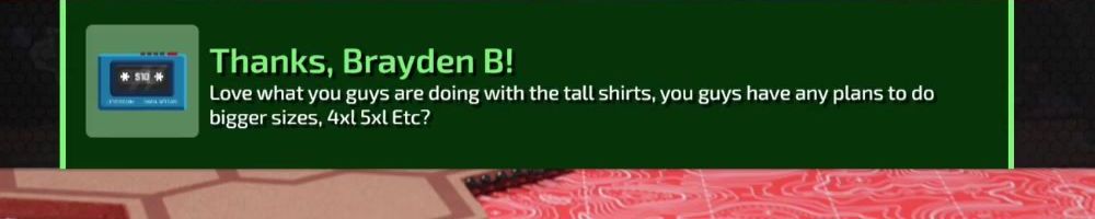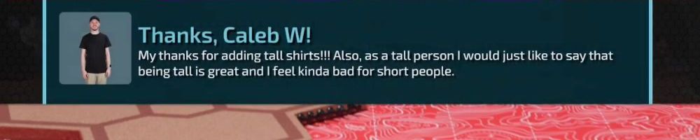 Thanks, Caleb W! My thanks for adding tall shirts!!! Also, as a tall person I would just like to say that being tall is great and I feel kinda bad for short people.