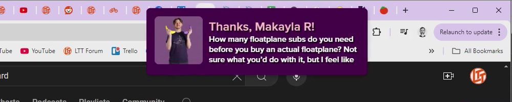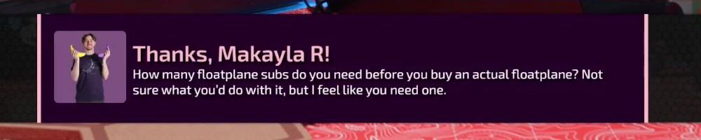 Thanks, Makayla R! How many floatplane subs do you need before you buy an actual floatplane? Not sure what you'd do with it, but I feel like