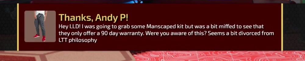 Thanks, Andy P! Hey LLD! I was going to grab some Manscaped kit but was a bit miffed to see that they only offer a 90 day warranty. Were you aware of this? Seems a bit divorced from LTT philosophy