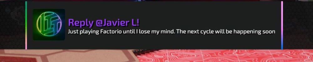 Reply @Javier L! Just playing Factorio until I lose my mind. The next cycle will be happening soon