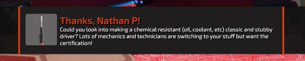 Thanks, Nathan P! Could you look into making a chemical resistant (oil, coolant, etc) classic and stubby driver? Lots of mechanics and technicians are switching to your stuff but want the certification!