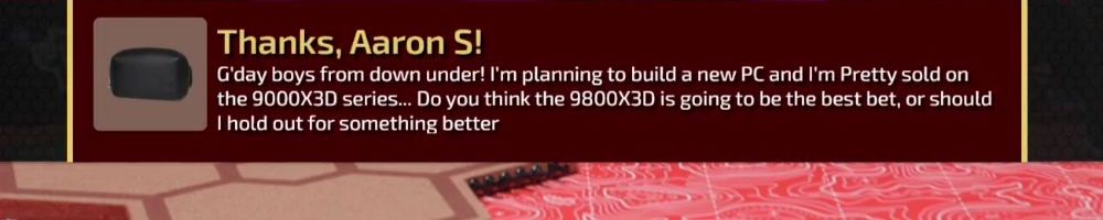 Thanks, Aaron S! G'day boys from down under! I'm planning to build a new PC and I'm Pretty sold on the 9000X3D series... Do you think the 9800X3D is going to be the best bet, or should I hold out for something better