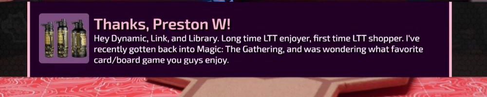 Thanks, Preston W! Hey Dynamic, Link, and Library. Long time LTT enjoyer, first time LTT shopper. I've recently gotten back into Magic: The Gathering, and was wondering what favorite card/board game you guys enjoy.
