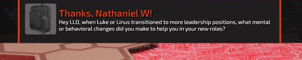 Thanks, Nathaniel W! Hey LLD, when Luke or Linus transitioned to more leadership positions, what mental or behavioral changes did you make to help you in your new roles?