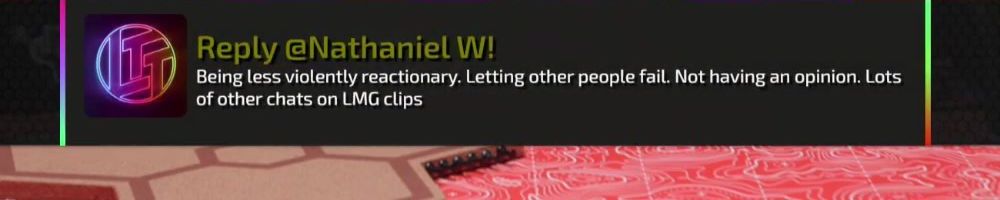 Reply @Nathaniel W! Being less violently reactionary. Letting other people fail. Not having an opinion. Lots of other chats on LMG clips