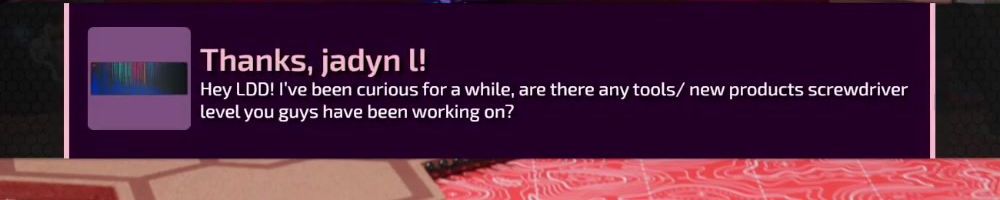 Thanks, jadyn U! Hey LDD! I've been curious for a while, are there any tools/ new products screwdriver level you guys have been working on?