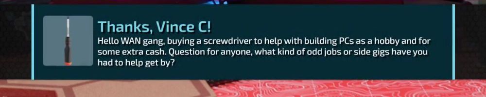 Thanks, Vince C! Hello WAN gang, buying a screwdriver to help with building PCs as a hobby and for some extra cash. Question for anyone, what kind of odd jobs or side gigs have you had to help get by?