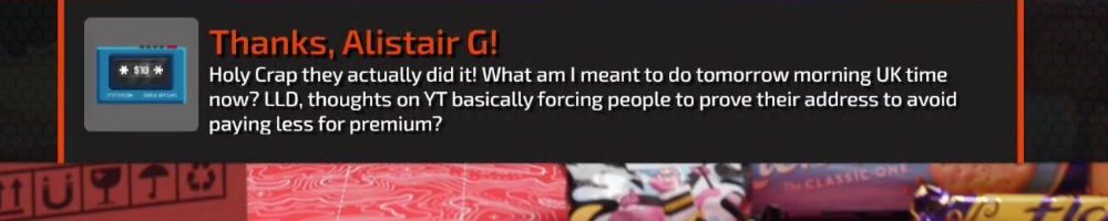 Thanks, Alistair G! Holy Crap they actually did it! What am I meant to do tomorrow morning UK time now? LLD, thoughts on YT basically forcing people to prove their address to avoid paying less for premium?