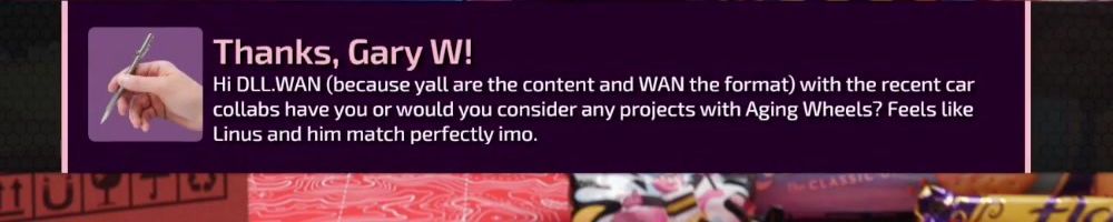 Thanks, Gary W! Hi DLLWAN (because yall are the content and WAN the format) with the recent car collabs have you or would you consider any projects with Aging Wheels? Feels like Linus and him match perfectly imo.