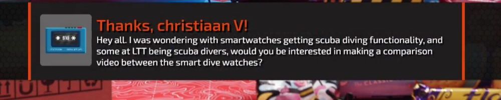 Thanks, christiaan V! Hey all. I was wondering with smartwatches getting scuba diving functionality, and some at LTT being scuba divers, would you be interested in making a comparison video between the smart dive watches?