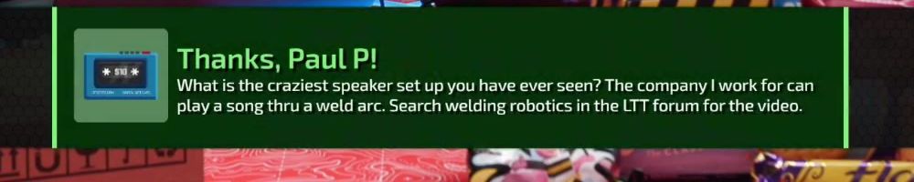 Thanks, Paul P! What is the craziest speaker set up you have ever seen? The company I work for can play a song thru a weld arc. Search welding robotics in the LTT forum for the video.