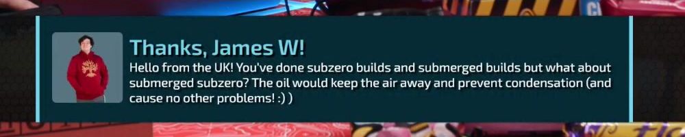 Thanks, James W! Hello from the UK! You've done subzero builds and submerged builds but what about submerged subzero? The oil would keep the air away and prevent condensation (and cause no other problems! :) )