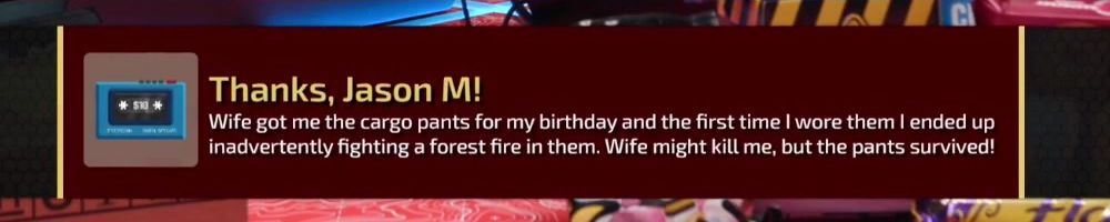 Thanks, Jason M! Wife got me the cargo pants for my birthday and the first time I wore them I ended up inadvertently fighting a forest fire in them. Wife might kill me, but the pants survived!