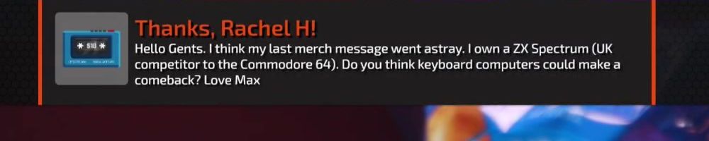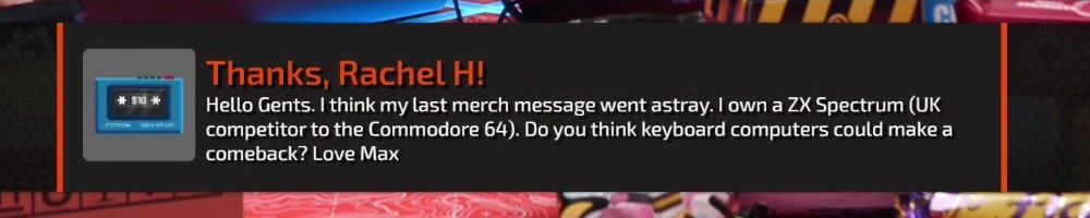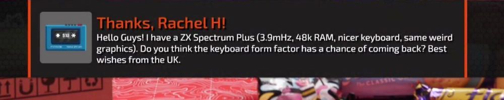 Thanks, Rachel H! Hello Guys! I have a ZX Spectrum Plus (3.9MHz, 48k RAM, nicer keyboard, same weird graphics). Do you think the keyboard form factor has a chance of coming back? Best wishes from the UK.