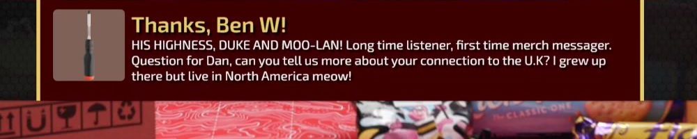 Thanks, Ben W! HIS HIGHNESS, DUKE AND MOO-LAN! Long time listener, first time merch messager. Question for Dan, can you tell us more about your connection to the U.K? I grew up there but live in North America meow!