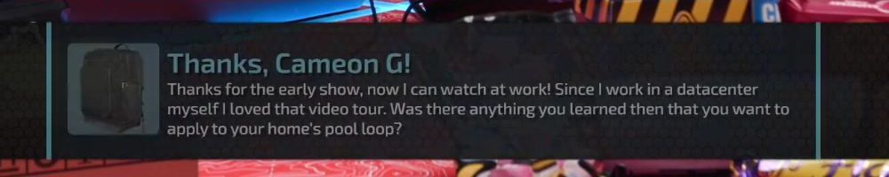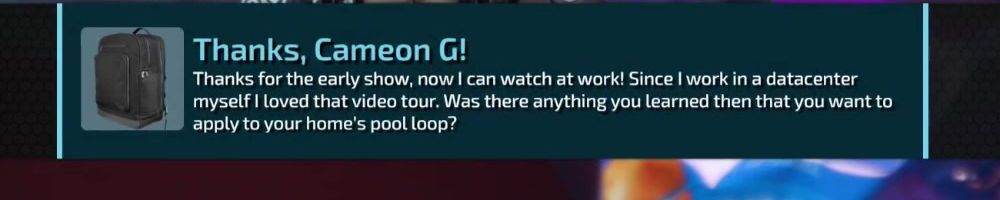 Thanks, Cameon G! Thanks for the early show, now I can watch at work! Since I work in a datacenter myself I loved that video tour. Was there anything you learned then that you want to apply to your home's pool loop?