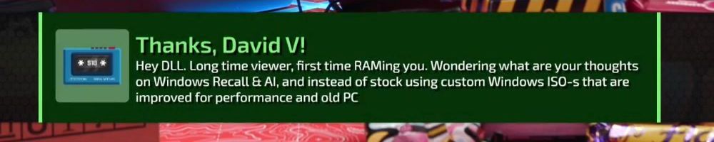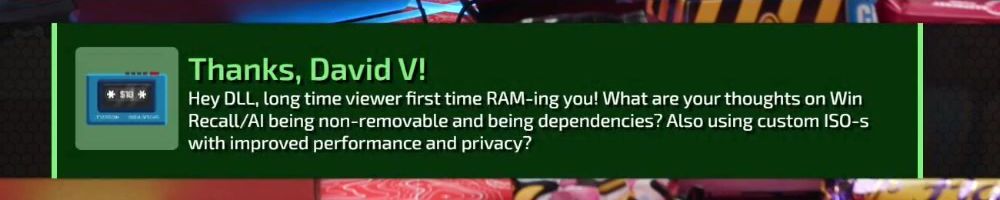 Thanks, David V! Hey DLL, long time viewer first time RAM-ing you! What are your thoughts on Win Recall/AI being non-removable and being dependencies? Also using custom ISO-s with improved performance and privacy?