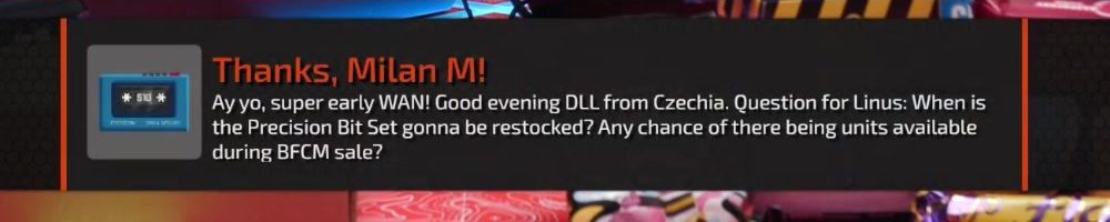 Thanks, Milan M! Ay yo, super early WAN! Good evening DLL from Czechia. Question for Linus: When is the Precision Bit Set gonna be restocked? Any chance of there being units available during BFCM sale?