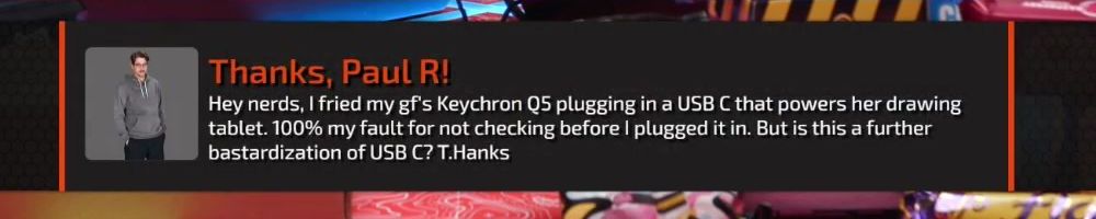 Thanks, Paul R! Hey nerds, I fried my gf's Keychron Q5 plugging in a USB C that powers her drawing tablet. 100% my fault for not checking before I plugged it in. But is this a further bastardization of USB C? T.Hanks