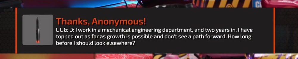 Thanks, Anonymous! L L & D: I work in a mechanical engineering department, and two years in, I have topped out as far as growth is possible and don't see a path forward. How long before I should look elsewhere?