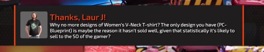 Thanks, Laur J! Why no more designs of Women's V-Neck T-shirt? The only design you have (PC-Blueprint) is maybe the reason it hasn't sold well, given that statistically it's likely to sell to the SO of the gamer?