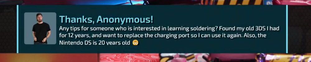 Thanks, Anonymous! Any tips for someone who is interested in learning soldering? Found my old 3DS I had for 12 years, and want to replace the charging port so I can use it again. Also, the Nintendo DS is 20 years old 😅