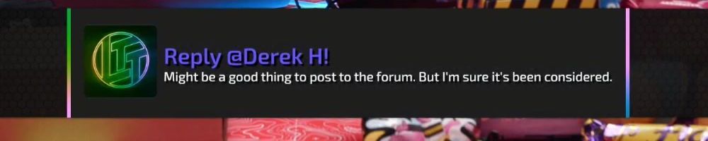 Reply @Derek H! Might be a good thing to post to the forum. But I'm sure it's been considered.