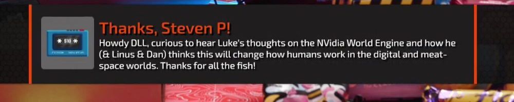Thanks, Steven P! Howdy DLL, curious to hear Luke's thoughts on the NVidia World Engine and how he (& Linus & Dan) thinks this will change how humans work in the digital and meat-space worlds. Thanks for all the fish!