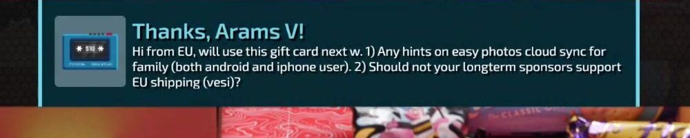 Thanks, Arams V! Hi from EU, will use this gift card next w. 1) Any hints on easy photos cloud sync for family (both android and iphone user). 2) Should not your longterm sponsors support EU shipping (vesi)?